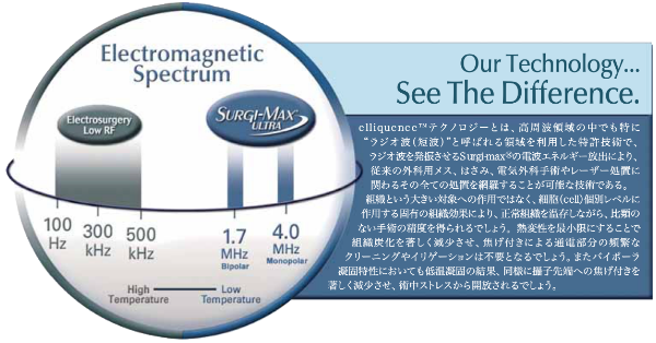 elliquence™のテクノロジーは、Ellman International 社(1959年設立)が取得した特許技術:ラジオ波手術器のテクノロジーを受け継いでおり、High Frequency(ラジオ波)、Low Temperature(低温)のラジオ波原理により、従来の金属メス、剪刀、電気メス、レーザーで行われてきた様々な手技においても代替使用が可能です。 細胞単位で働きかけるラジオ波の作用で正常な組織を保存(温存)し、これまでにない微細な外科処置が可能となります。